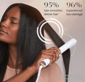 Во время укладки стайлер подаёт поток прохладного воздуха, который помогает зафиксировать результат и уменьшает термовоздействие. Благодаря пяти режимам нагрева он подходит для разных типов волос — от тонких и ломких до плотных и густых. Лучше использовать его после предварительной сушки феном, так как прибор не предназначен для высушивания влажных волос.