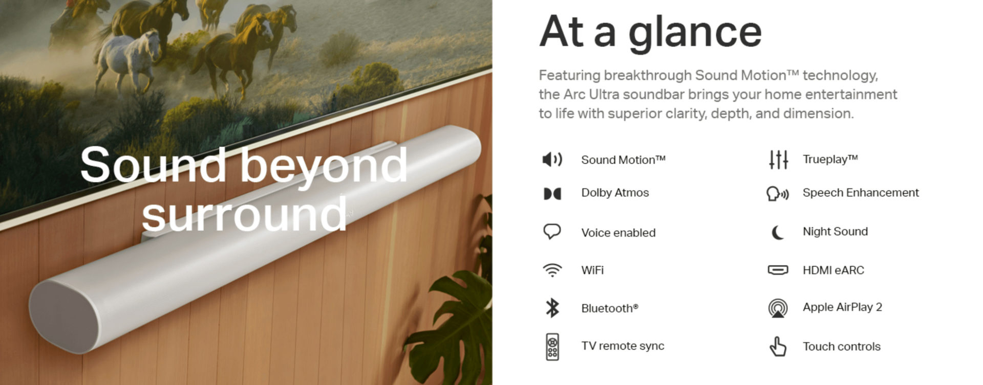 Arc Ultra впечатляет своим дизайном звука: маленький «Sound Motion» драйвер баса выдаёт приличные низкие частоты без отдельного сабвуфера, обеспечивая отличную балансировку. Диалоги чёткие и естественные, эффекты объёмные и «вырываются» из микса. Dolby Atmos 3D создаёт слой и движение для каждого звука — огромный шаг вперёд по сравнению с обычными динамиками ТВ.