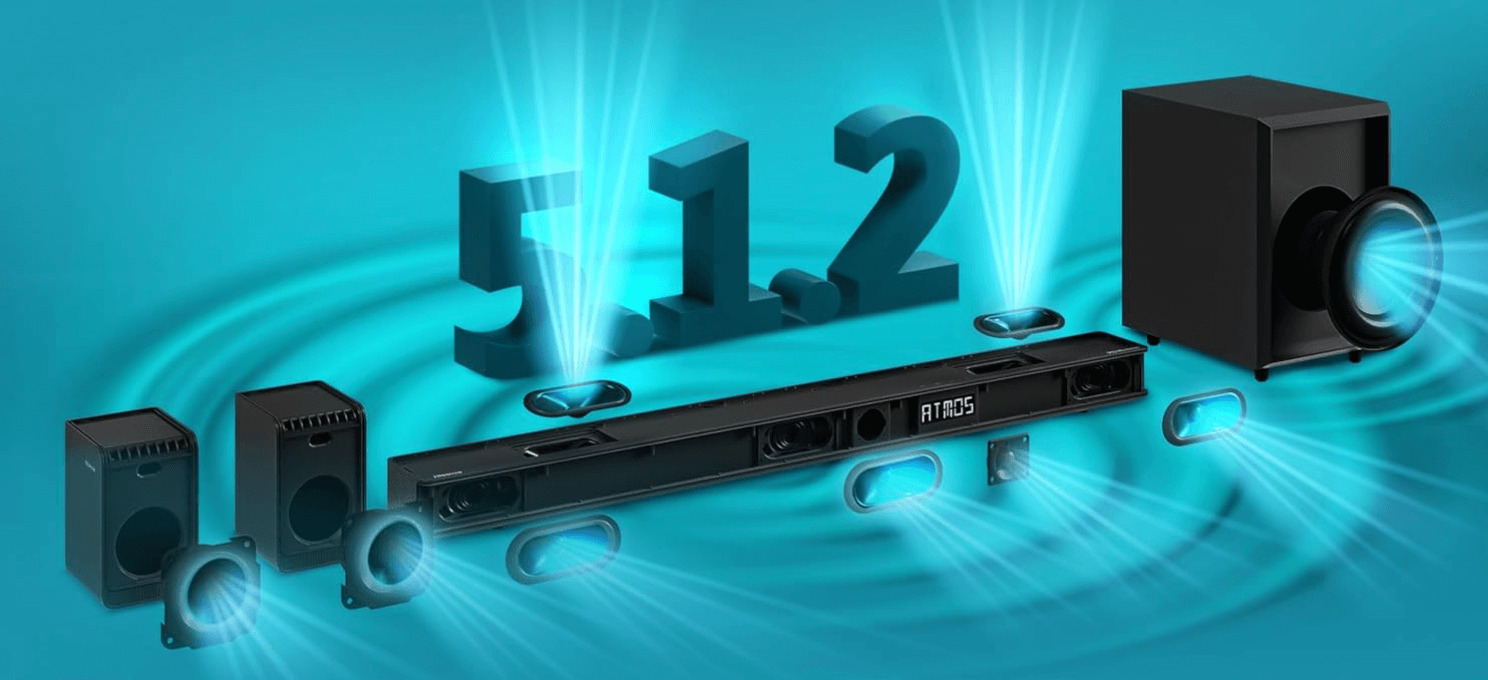 Настоящий объёмный звук требует размещения динамиков вокруг слушателя. Некоторые саундбары, например Samsung Q990D или Hisense AX5125H, комплектуются сабвуфером и задними колонками.