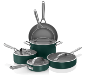 Этот набор посуды из твердого анодированного алюминия обладает прочным антипригарным покрытием, не подверженным царапинам и отслаиванию, и выдерживает температуру в духовке до 500°F (около 260°C). Антипригарная поверхность обеспечивает лёгкое приготовление и чистку, не оставляя следов и не требуя чрезмерного масла. Посуда рассчитана на интенсивное использование, включая высокотемпературное жарение и активное мытьё.