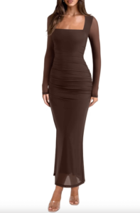Это макси-платье выполнено из мягкой и эластичной ткани на основе полиэстера и спандекса, которая приятно прилегает к телу и не просвечивает. Материал лёгкий, дышащий и шелковистый на ощупь, поэтому в платье комфортно даже при длительном ношении. Квадратный вырез эффектно подчёркивает зону декольте и линию ключиц, создавая женственный и современный акцент. Полупрозрачная сетка с длинными рукавами и открытой частью спины добавляет образу глубины и визуального объёма. Драпировка по бокам в области талии и бёдер красиво моделирует фигуру и делает силуэт более стройным. Платье подчёркивает формы, не сковывая движения и не создавая ощущения излишней обтянутости. Оно отлично подойдёт для вечеринок, свиданий, коктейльных мероприятий, концертов и праздничных выходов. Для сохранения формы и качества ткани рекомендуется бережная стирка вручную или в деликатном режиме в мешке для белья.
