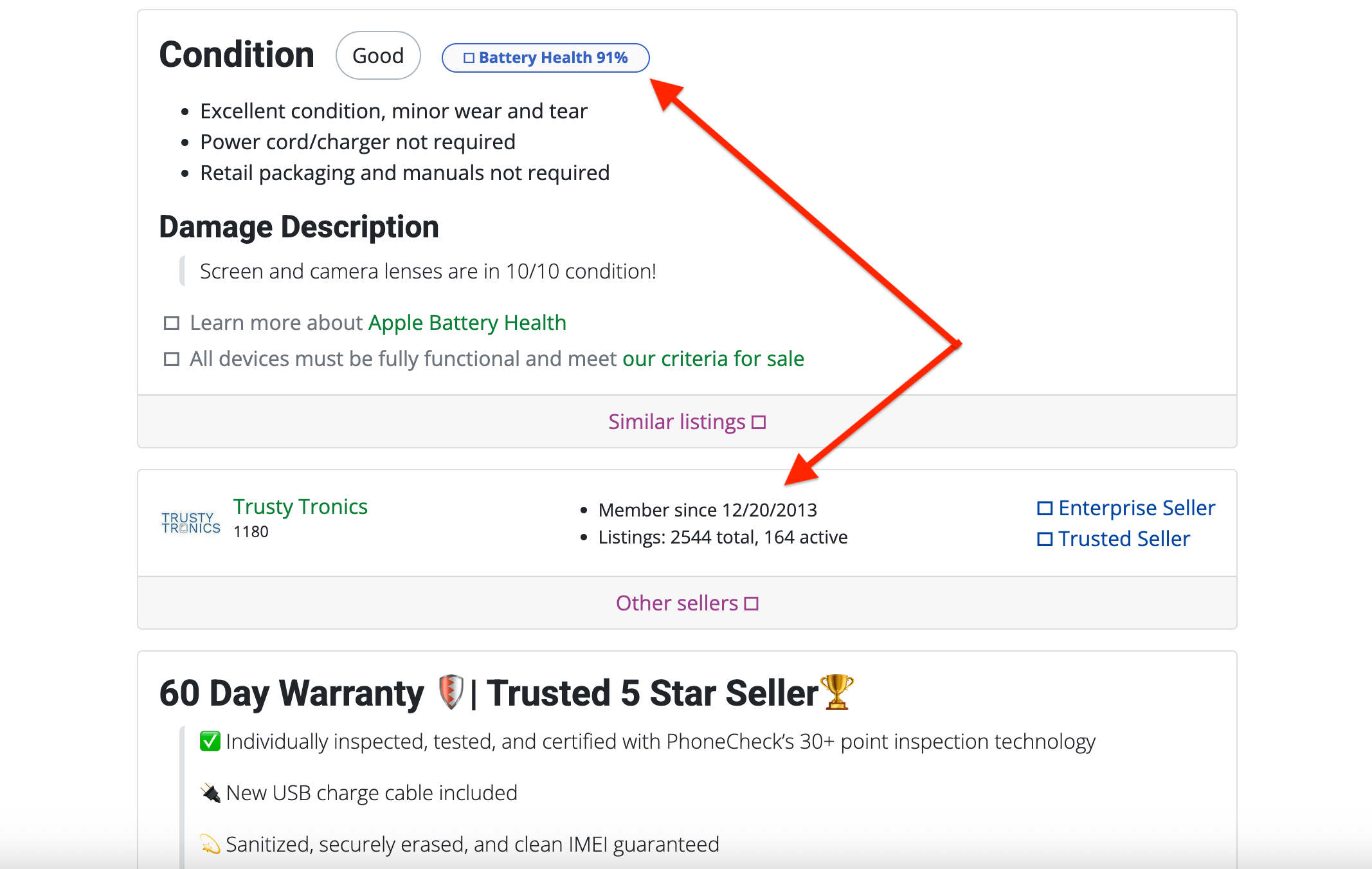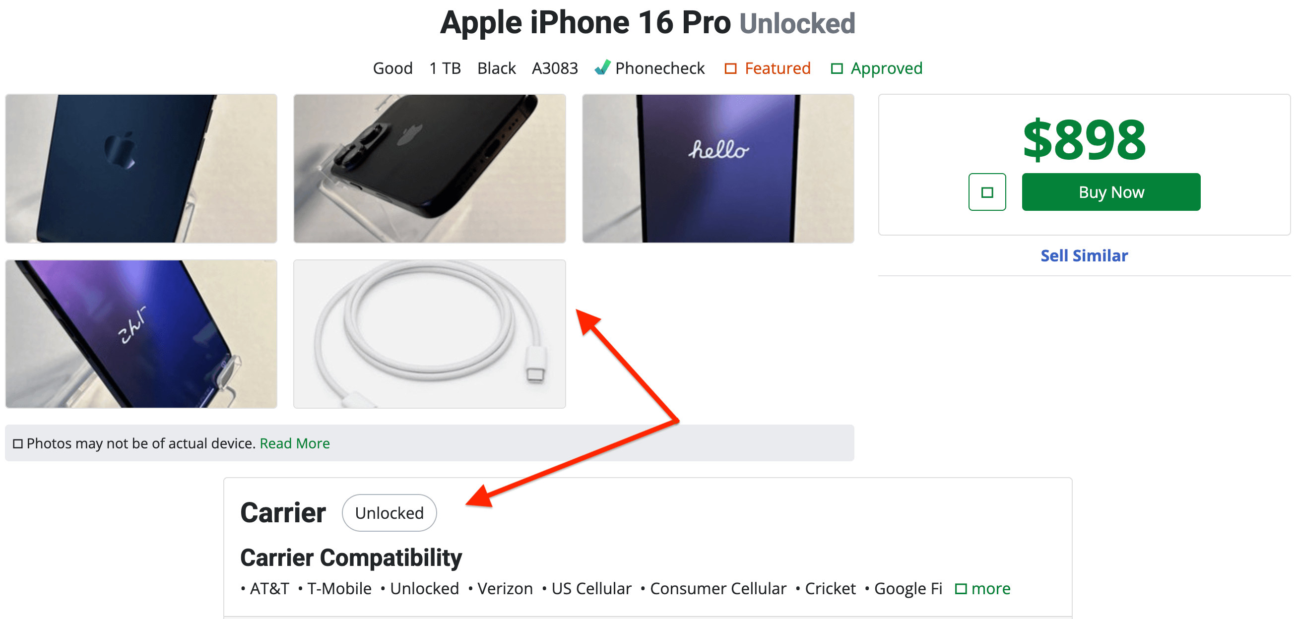 Для iPhone та інших смартфонів дуже важливо переконатися, що IMEI чи ESN чистий. У оголошенні на Swappa вказується результат перевірки, який підтверджує, що пристрій не заблоковано, не значиться в чорному списку і не прив’язаний до оператора. Це особливо важливо, якщо ви плануєте використати смартфон за межами США.